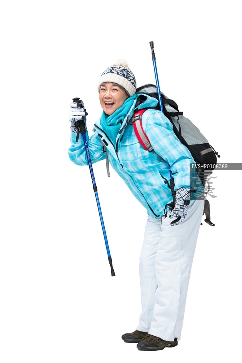 图片标题: 老年女人冬季登山旅行