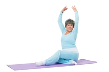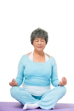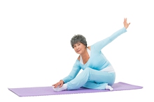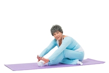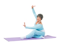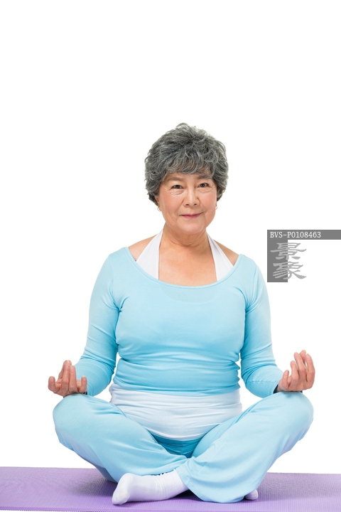 图片标题: 老年女人坐在瑜伽垫上