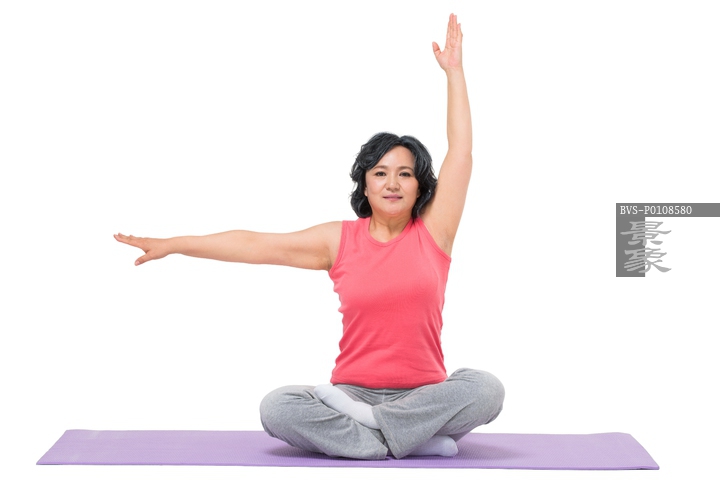 图片标题: 中老年女人坐在瑜伽垫上
