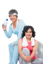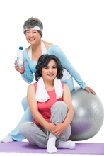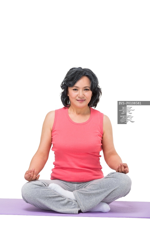 图片标题: 中老年女人坐在瑜伽垫上