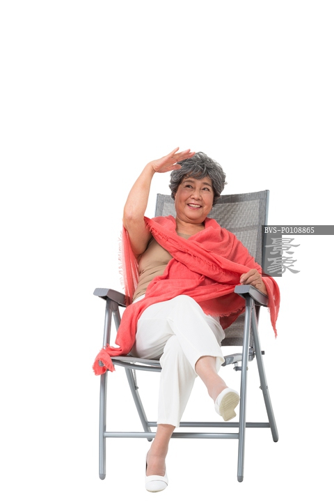 图片标题: 中老年女人坐在沙滩椅上