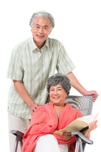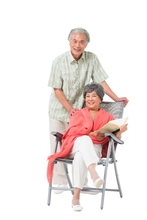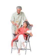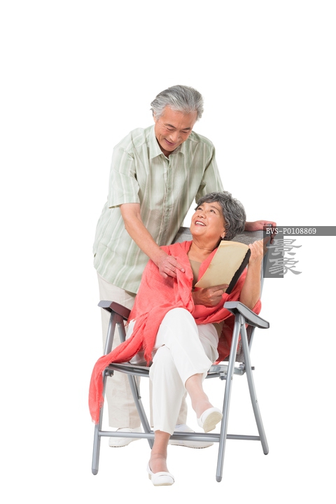 图片标题: 快乐的老年夫妇坐在沙滩椅上