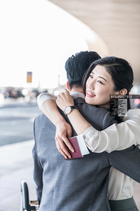 图片标题:     年轻情侣在机场团聚拥抱