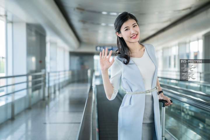 图片标题: 年轻商务女士在机场乘坐移动电梯
