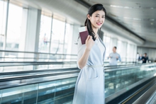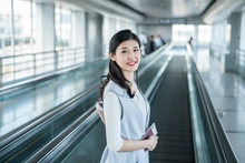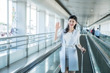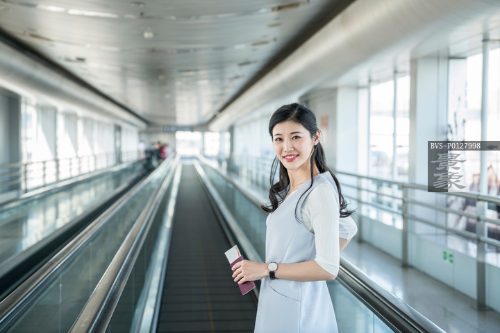 图片标题: 年轻商务女士在机场乘坐移动电梯