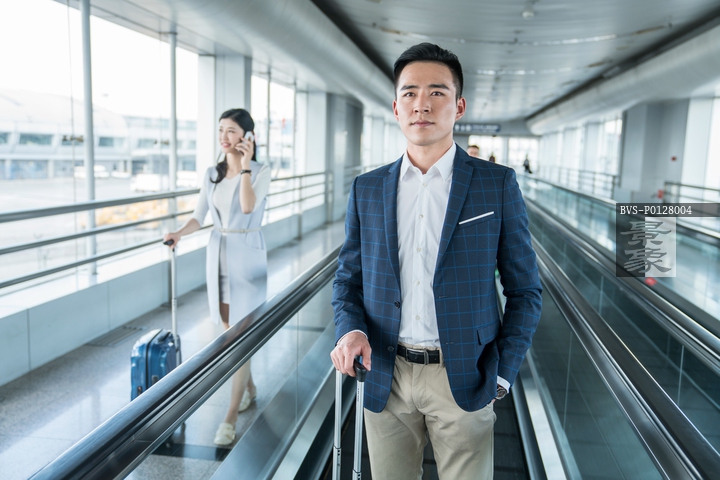 图片标题: 年轻商务人士在机场乘坐移动电梯