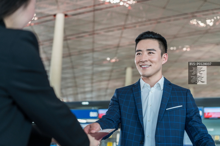 图片标题: 年轻商务男士在机场出示护照