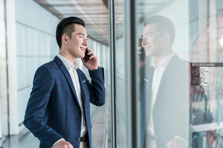 图片标题: 年轻商务男士在机场打电话