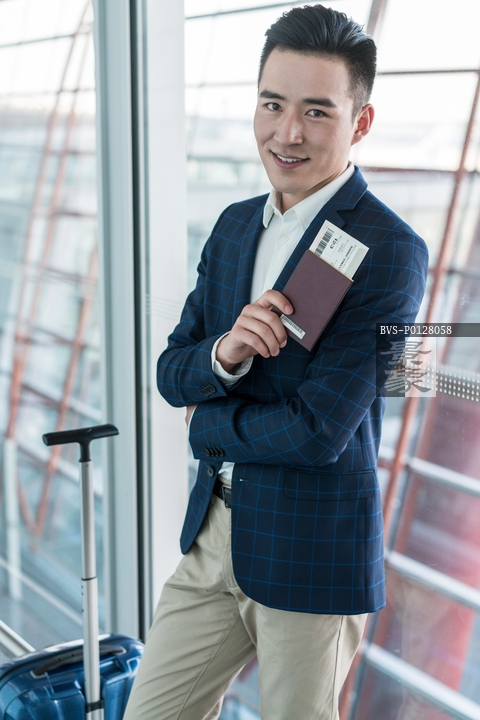 图片标题: 年轻商务男士在机场拿着护照和机票