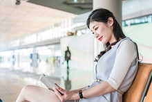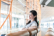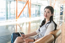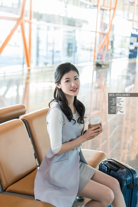 图片标题: 年轻商务女士在机场喝咖啡