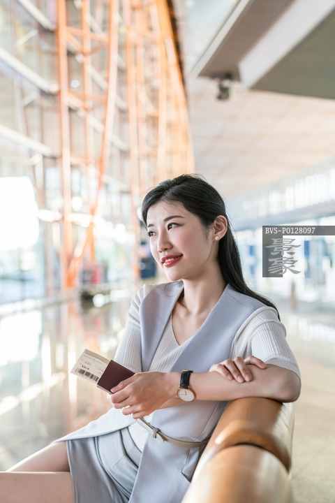 图片标题: 年轻商务女士在候机室拿着护照机票