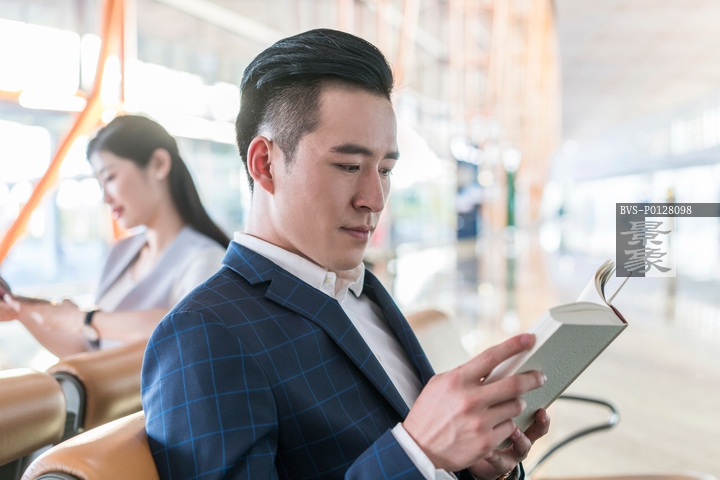 图片标题:     年轻商务男士在候机室看书