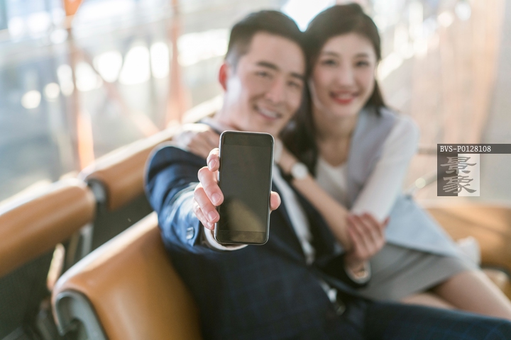 图片标题: 年轻情侣在候机室展示手机