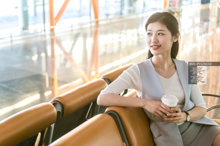 图片标题: 年轻商务女士在候机室喝咖啡