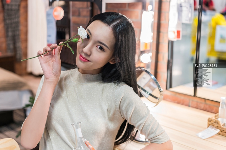 图片标题: 年轻女子手拿鲜花