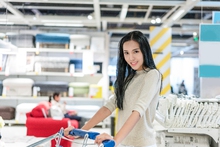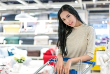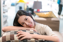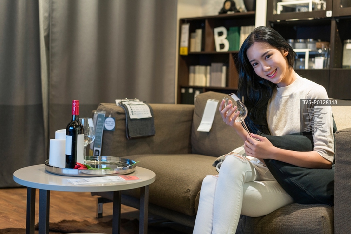 图片标题: 年轻女子坐在沙发上手拿红酒杯