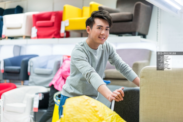 图片标题: 年轻男子挑选沙发
