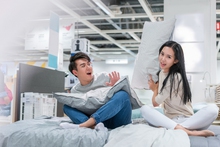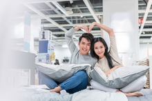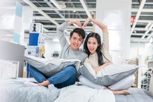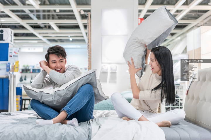 图片标题: 甜蜜的年轻情侣在床上打枕头仗