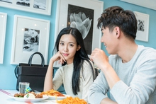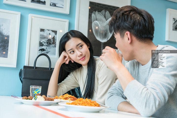 图片标题: 甜蜜的年轻情侣在餐厅用餐
