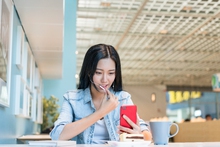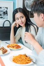 图片标题: 甜蜜的年轻情侣在餐厅用餐