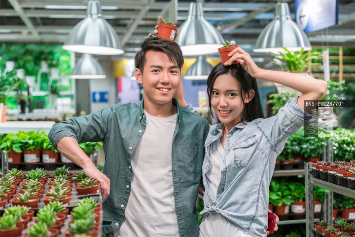 图片标题: 年轻情侣选购花花草草