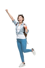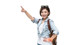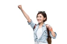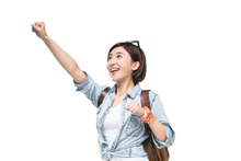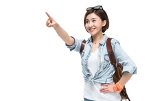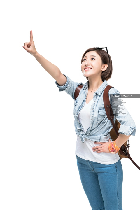 图片标题: 快乐的年轻女子徒步旅行