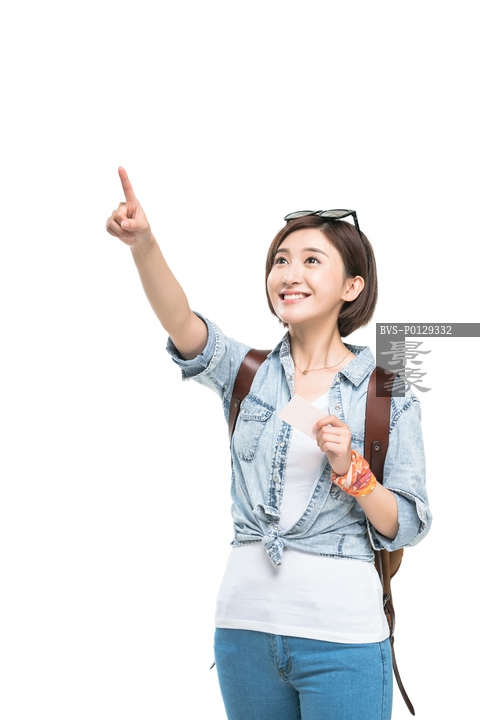 图片标题: 快乐的年轻女子徒步旅行
