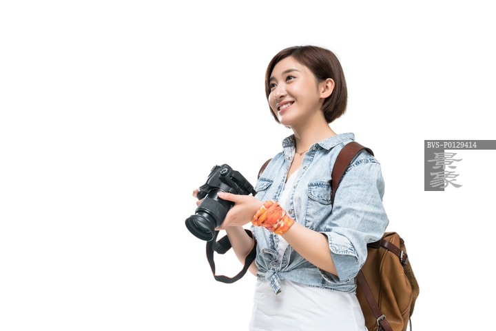 图片标题: 快乐的年轻女子拿着相机徒步旅行