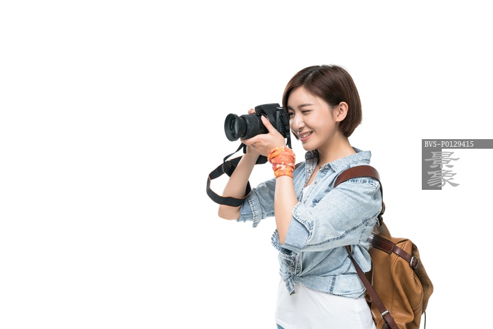 图片标题: 快乐的年轻女子拿着相机徒步旅行