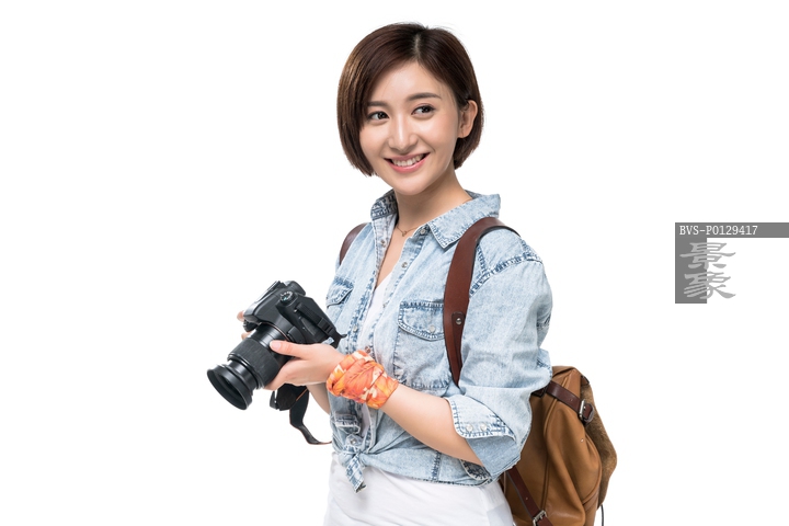 图片标题:     快乐的年轻女子拿着相机徒步旅行