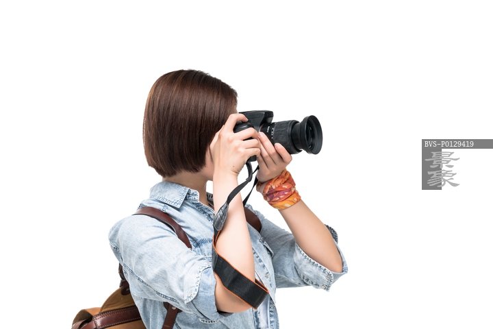 图片标题: 快乐的年轻女子拿着相机徒步旅行