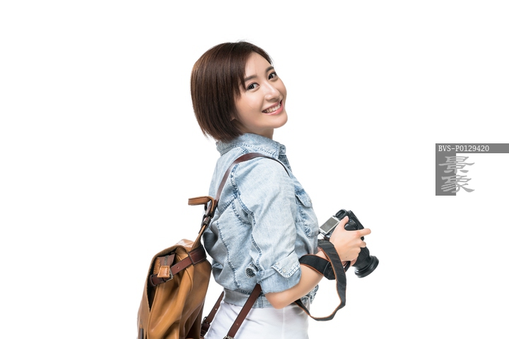 图片标题:     快乐的年轻女子拿着相机徒步旅行