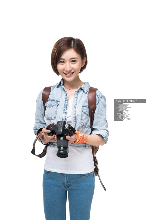图片标题: 快乐的年轻女子拿着相机徒步旅行