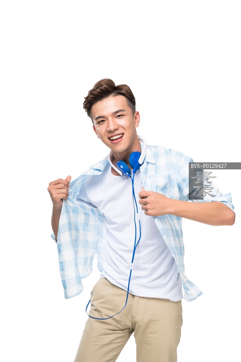 图片标题: 快乐的年轻男子挂着耳麦