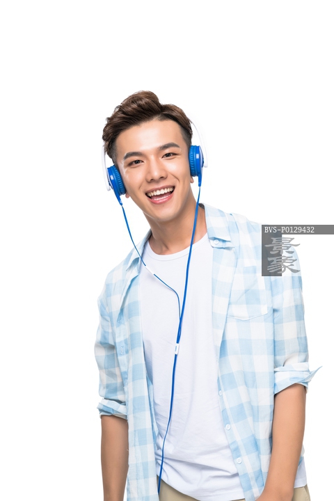 图片标题:     快乐的年轻男子拿着耳麦