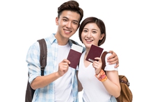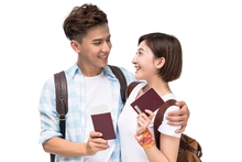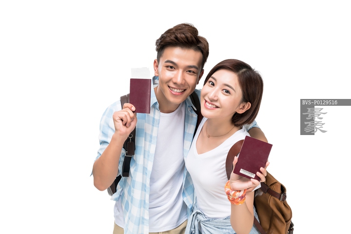 图片标题: 快乐的年轻情侣拿着护照去旅行