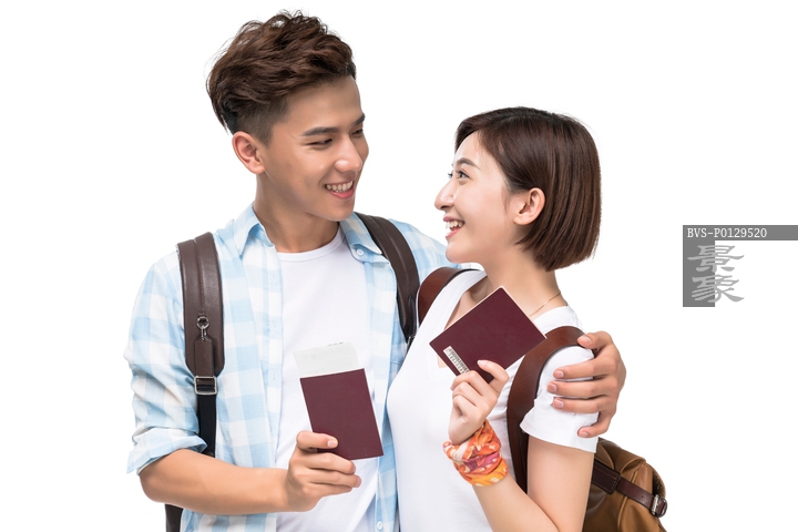 图片标题: 快乐的年轻情侣拿着护照去旅行