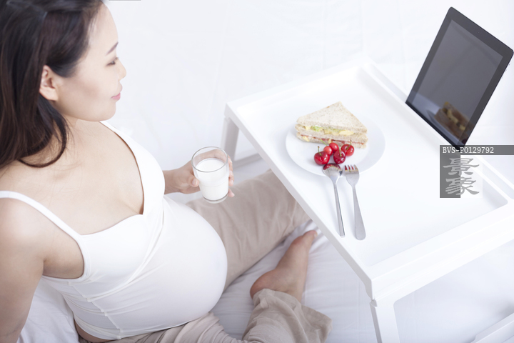 图片标题: 孕妇健康饮食主题,孕妇在家喝牛奶吃三明治
