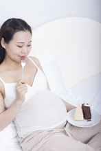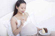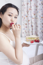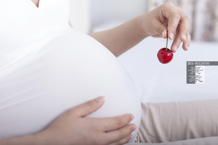 图片标题:     孕妇健康饮食主题,孕妇拿着樱桃