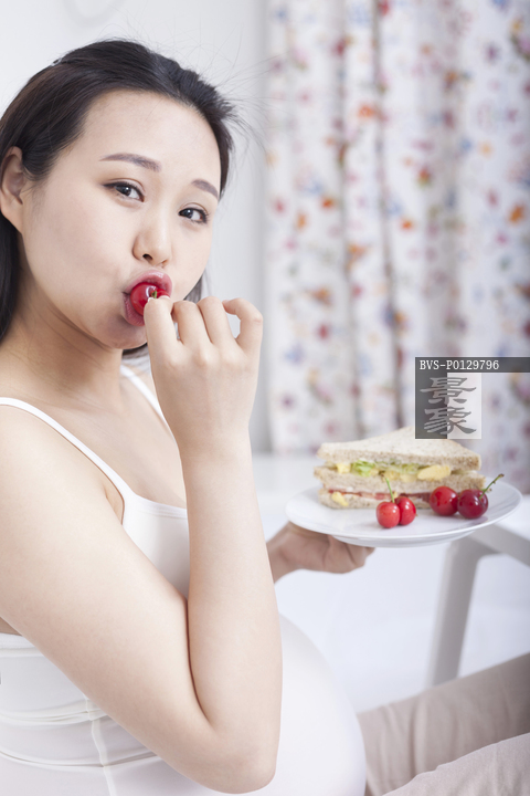 图片标题: 孕妇健康饮食主题,孕妇在家吃水果和三明治