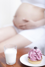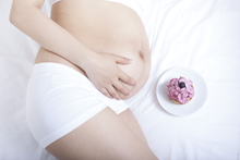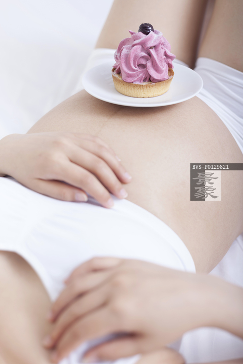 图片标题: 孕妇仰卧在床上拿着蛋糕