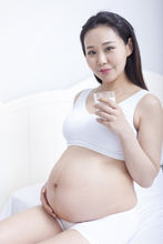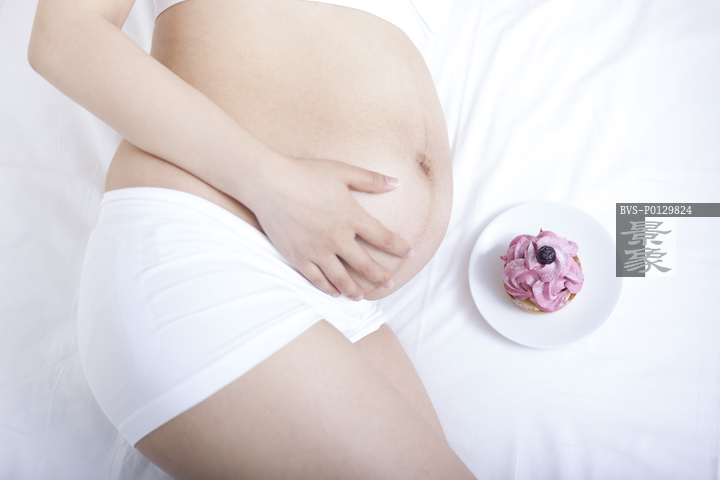 图片标题:     孕妇侧卧在床上拿着蛋糕