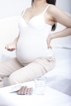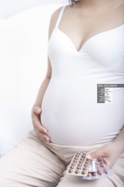 图片标题: 孕妇坐在床上,手里拿着药丸
