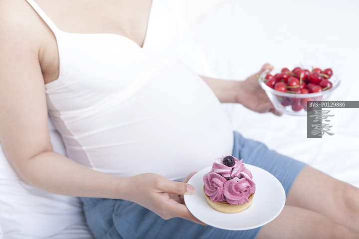 图片标题: 孕妇坐在床上拿着水果和蛋糕