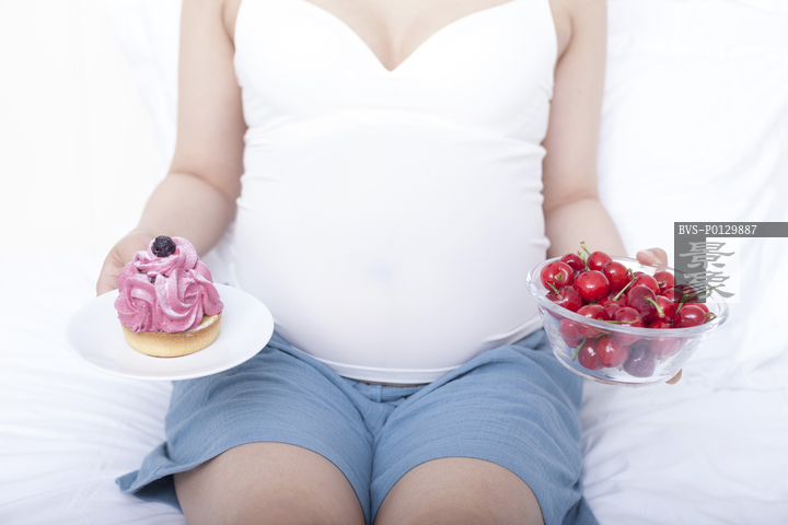 图片标题: 孕妇坐在床上拿着水果和蛋糕