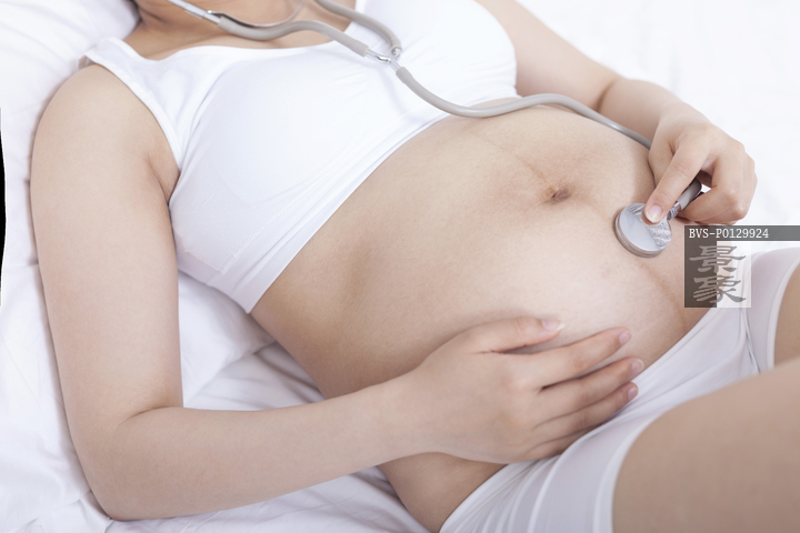 图片标题: 孕妇戴听诊器听胎儿声音