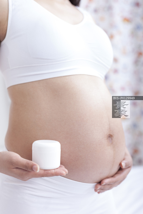 图片标题: 孕妇在肚子上抹乳液