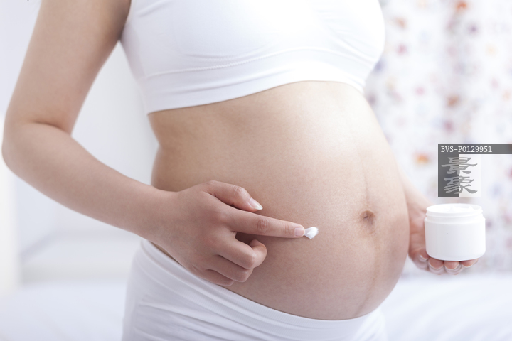图片标题: 孕妇在肚子上抹乳液