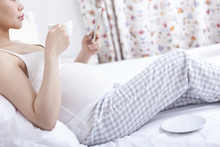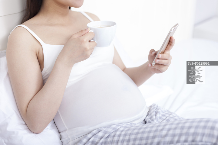 图片标题:     孕妇坐在床上一边使用手机一边喝着饮料