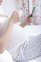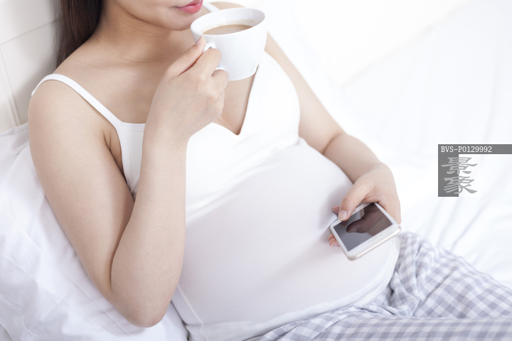 图片标题:     孕妇坐在床上一边使用手机一边喝着饮料